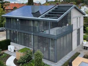 Juist bij dit type architectuur is zonwering geen bijzaak, maar een integraal onderdeel van het ontwerp. Te veel zonbelasting leidt tot oververhitting, verblinding en verlies van comfort. Te zware systemen verstoren het gevelbeeld. De uitdaging lag dus in het vinden van een oplossing die zowel technisch als esthetisch volledig klopt.